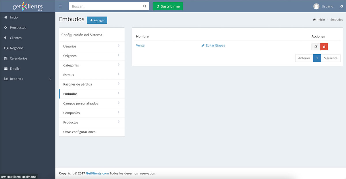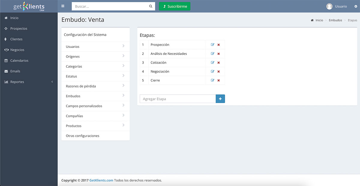 El Sistema pre-configura un Pipeline llamado "Ventas" que incluye las Etapas de: "Prospección", "Análisis", "Propuesta", "Negociación" y "Cierre". Es posible editar este Embudo llamado "Ventas" o agregar otros Pipelines.