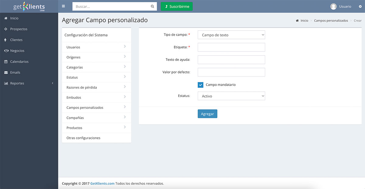 Campo Personalizado: Podemos registrar y evaluar información específica de cada Producto, Servicio o Prospecto (algún dato que sea importante para nuestro negocio). Configurando Campos Personalizados podemos hacerlo.