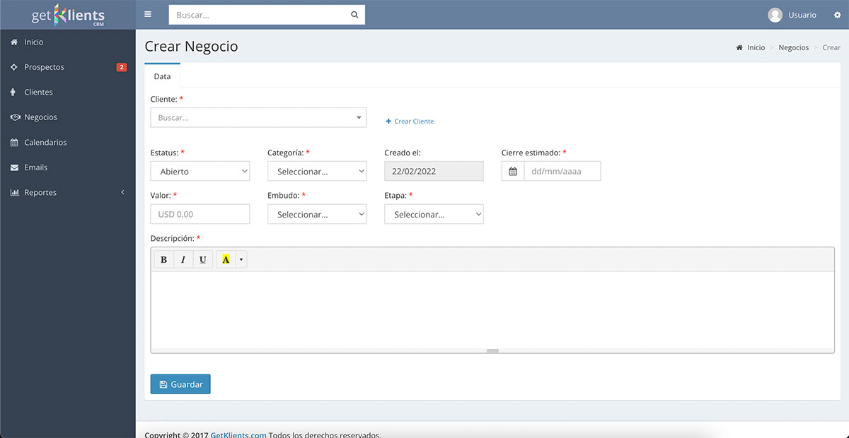 En el módulo de Negocios podremos gestionar todas las ventas con su distintas etapas. Es conocido que una de las principales razones por las que se pierde un Negocio es por la falta de seguimiento. Con Getklients podemos administrar una gran cantidad de Negocios y darles el seguimiento que requieren, con campos como el Estatus, la Fecha de Cierre Estimada, la Categoría y la Descripción de las gestiones realizadas.