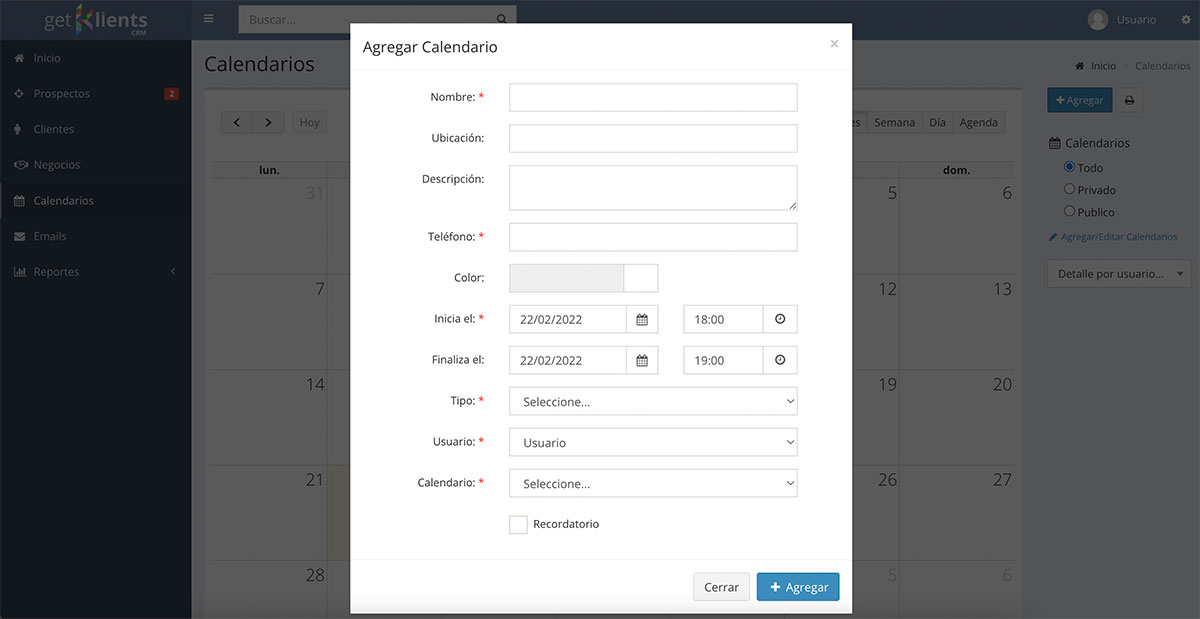 Organice su agenda personal y las de sus colaboradores con el módulo Calendarios de Getklients. A través de esta herramienta podemos programar y notificar al correo electrónico cualquier reunión.