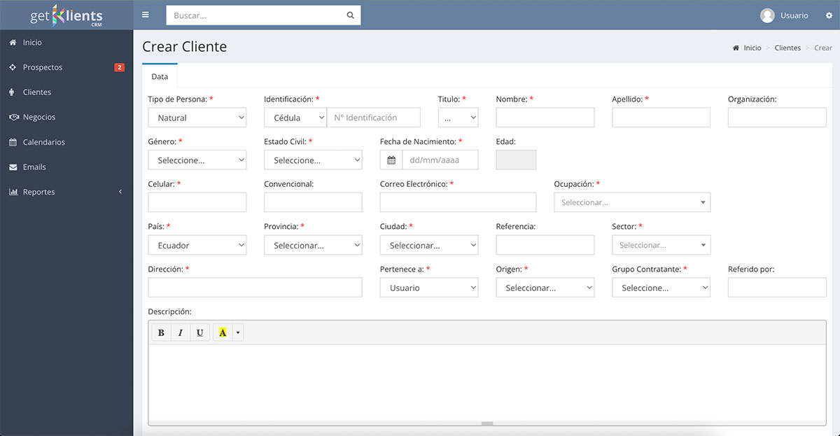 En el módulo de Clientes podremos gestionar los datos de los clientes del negocio tales como identificación, origen, datos de contacto. En una pantalla es posible adjuntar archivos, enviar emails y revisar los negocios asociados a un cliente