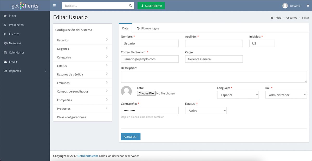 - Ejecutivo: Usuario no tiene acceso a las Configuraciones del Sistema y solo puede ver la data creada por el mismo, o compartida por otro Usuario.