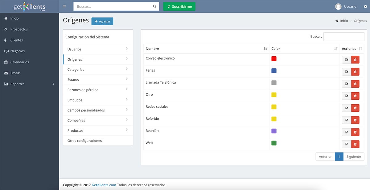 Orígenes: Con Getklients podemos registrar y evaluar las principales Fuentes de Prospectos, por ejemplo: Amigos, Familiares, Clientes, Asociaciones, etc. De esta manera, podemos potencializar nuestras gestiones de Marketing en aquellas Fuentes que resulten más rentables.