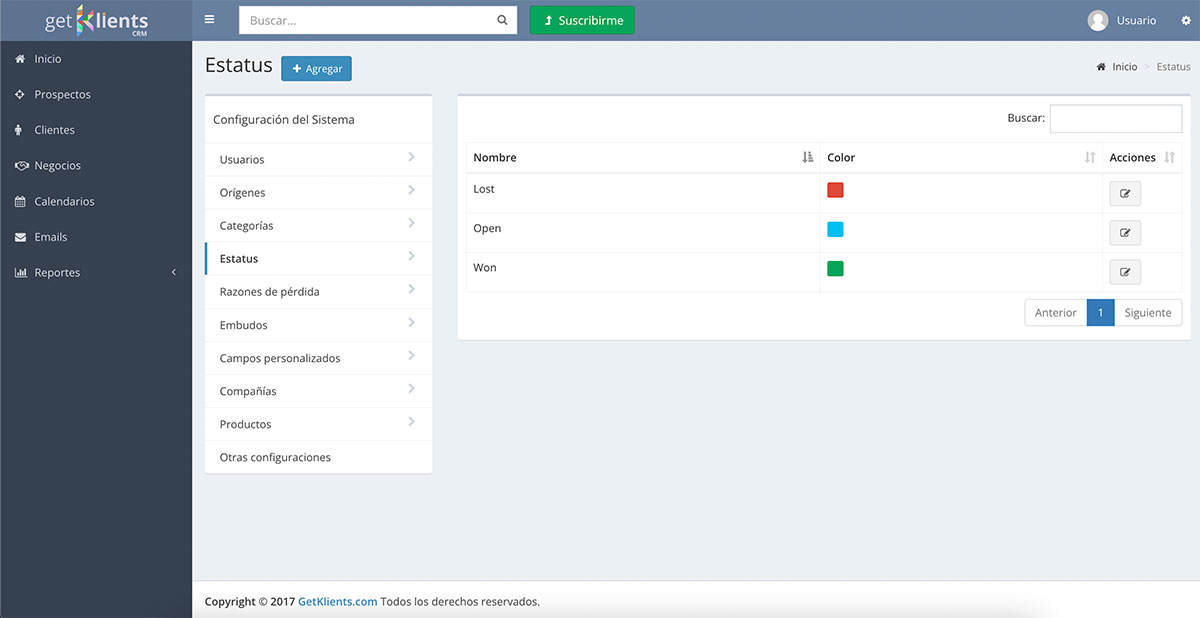 Estatus: Podemos registrar el Estatus de cada una de nuestras Oportunidades de Negocio (Prospectos) y enfocarnos en aquellas que continúan "Abiertas" (pendientes de realizar alguna gestión). Por defecto hemos pre-configurado 3 Estatus: "Ganadas", "Perdidas" o "Abiertas".